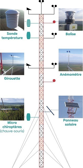 Un mât de mesure est installé afin de recueillir des données locales. Ce mât de mesure, d’une hauteur d’environ 103 mètres, est équipé de plusieurs types d’instruments de mesures, à différentes hauteurs : des girouettes (direction du vent) et anémomètres (vitesse du vent). Des micros à ultra-sons y sont également installés durant certaines périodes de l’année, afin de compléter les données de l’étude faune et flore sur l’activité des chauves-souris en altitude.